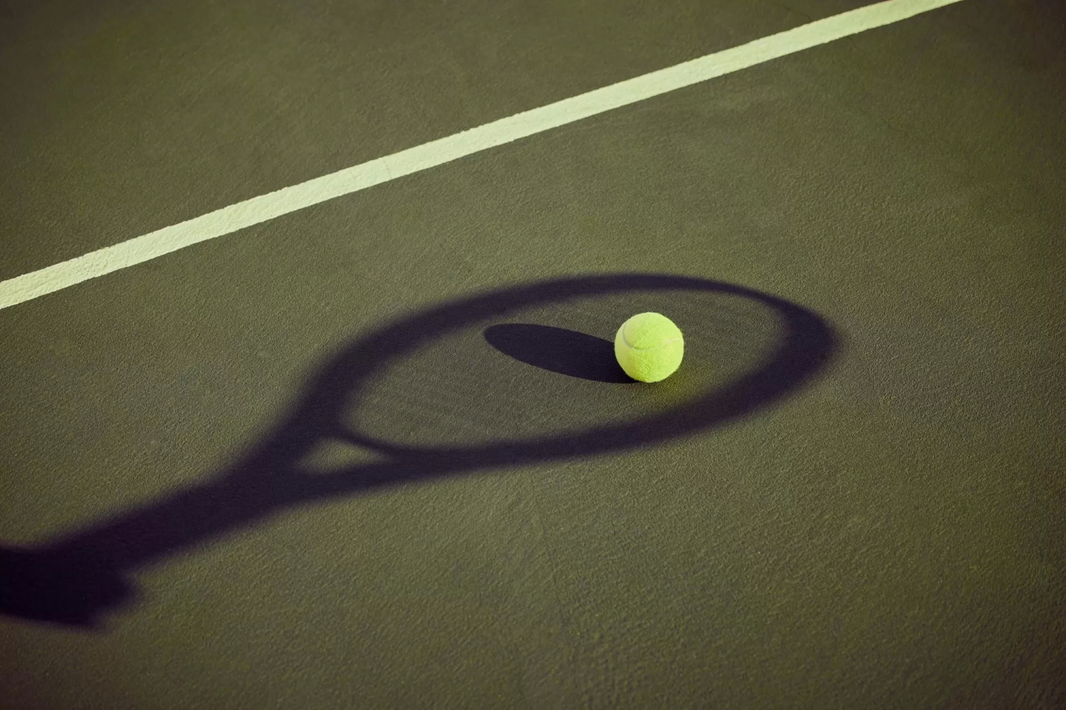 یک توپ تنیس روی زمین افتاده و سایه راکت تنیس برای ضربه زدن آماده است