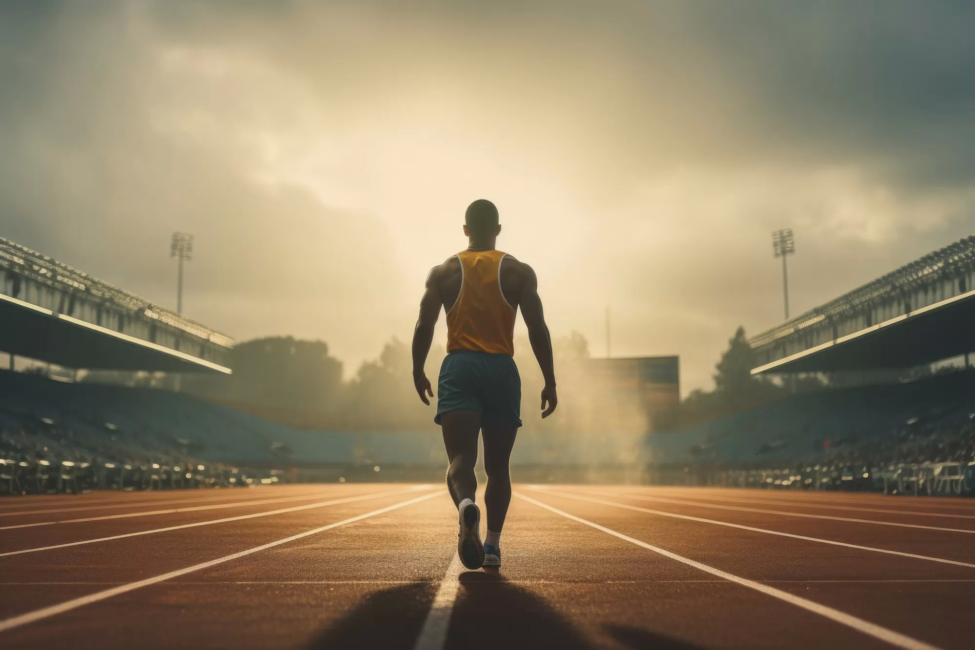 یک دونده حرفهای در مسیر مسابقه در حال آماده سازی خود برای شروع یک دور جدید است