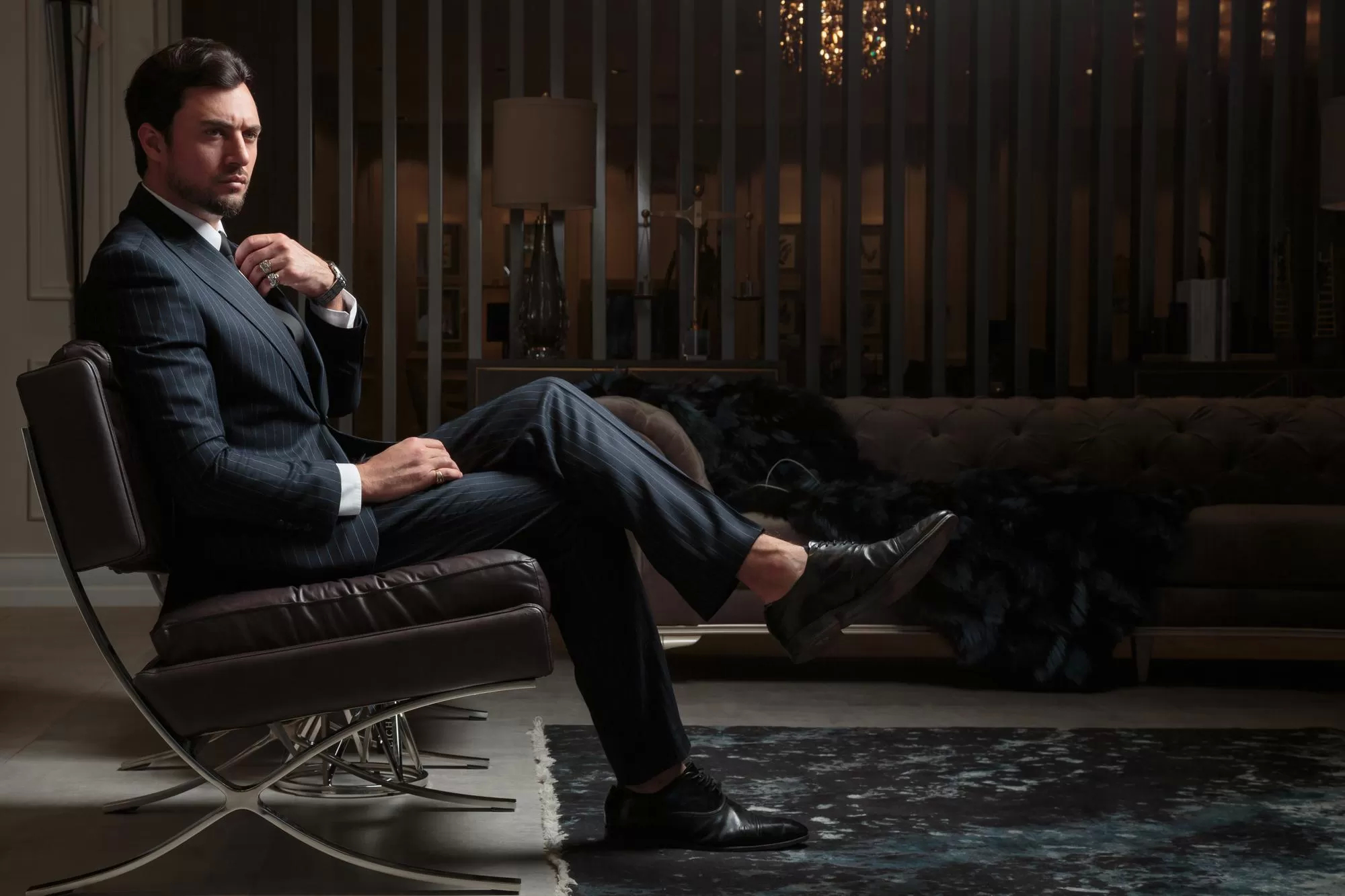 یک مرد جوان در حالی که کت و شلوار مشکی راه راه رسمی به تن دارد روی یک صندلی نشسته است