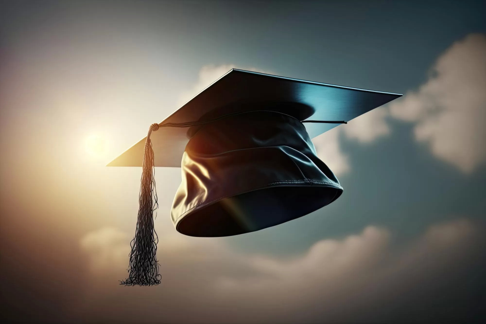یک کلاه فارغ التحصیلی مشکی که به هوا پرتاب شده با پس زمینه آسمان