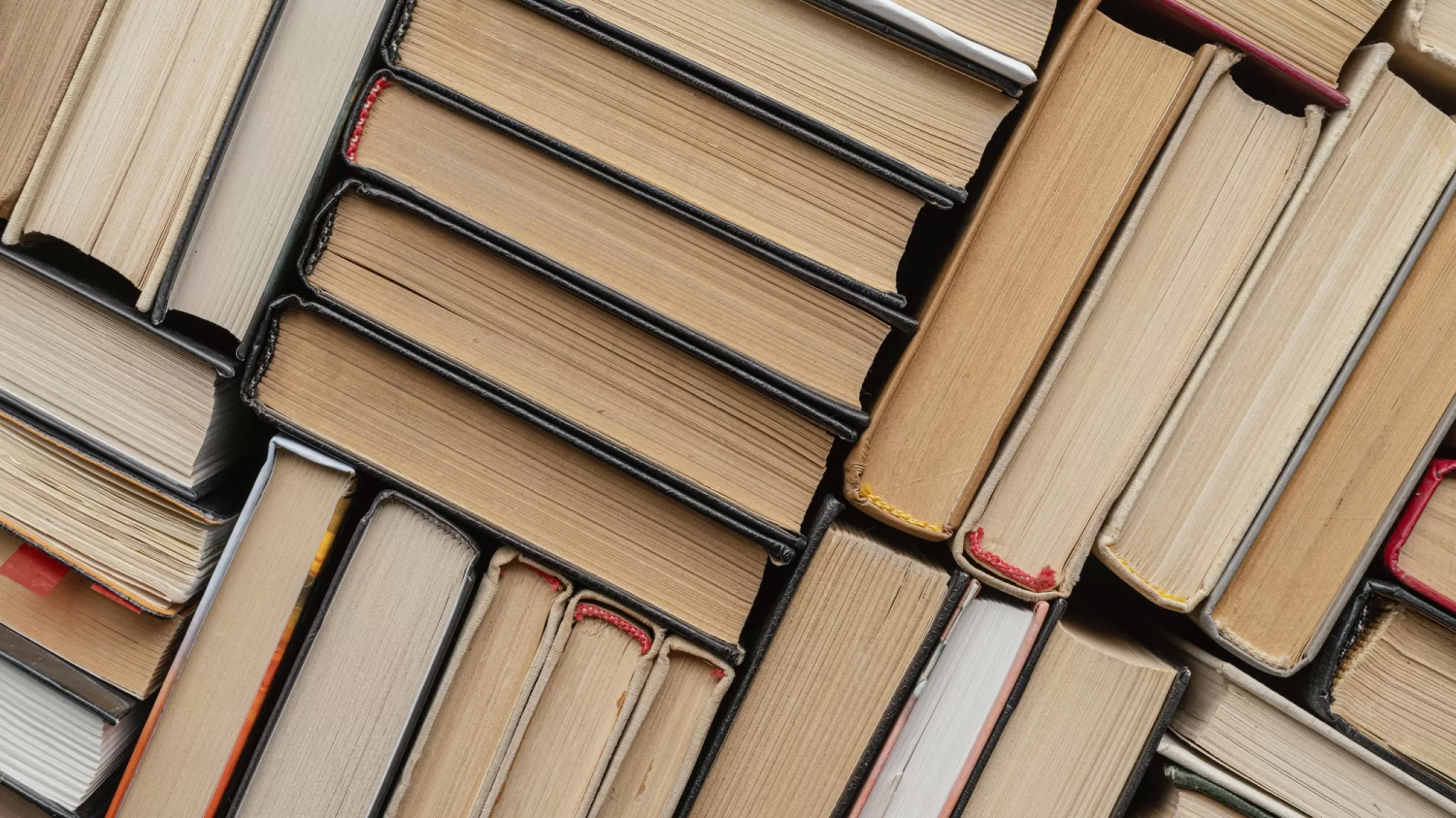 تعدادی کتاب در کنار هم چیده شدهاند و از نمای بالایی از آنها عکاسی شده است.