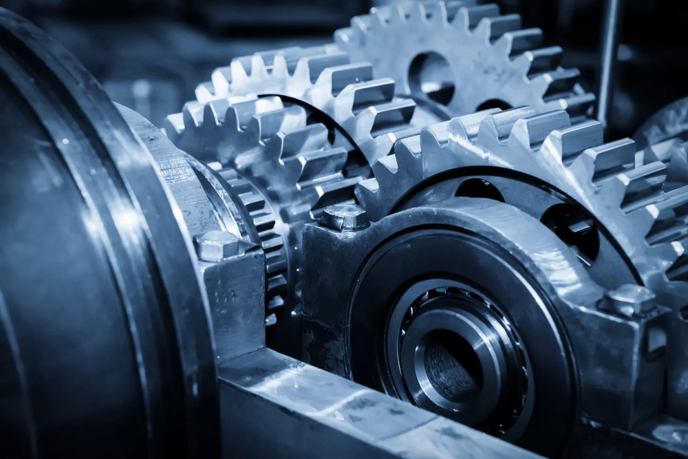 نمای نزدیک از تعدادی چرخ دنده بزرگ در یک ماشین صنعتی مستقر در یک کارخانه